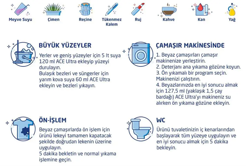 Fayans, marley, seramik, küvet, lavabo, mutfak tezgahı gibi yıkanabilir yüzeylerde: 15 L Suya 170 ml (yaklaşık 2 çay bardağı) ACE ekleyin. Yüzeyi temizleyin, 10 dakika bekleyin ve durulayın.