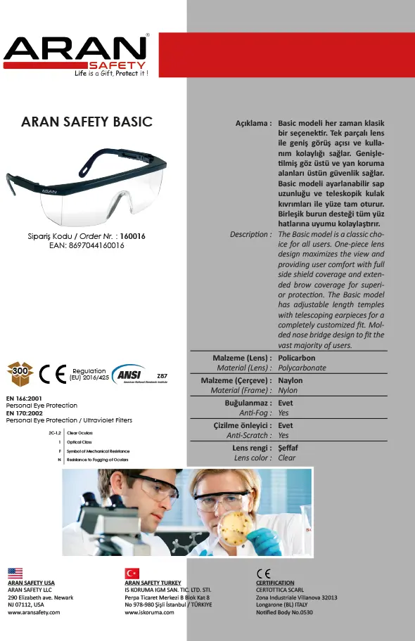 Basic modeli her zaman klasik bir seçenektir. Tek parçalı lens ile geniş görüş açısı ve kullanım kolaylığı sağlar. Genişletilmiş göz üstü ve yan koruma alanları üstün güvenlik sağlar. Basic modeli ayarlanabilir sap uzunluğu ve teleskopik kulak kıvrımları ile yüze tam oturur. Birleşik burun desteği tüm yüz hatlarına uyumu kolaylaştırır.