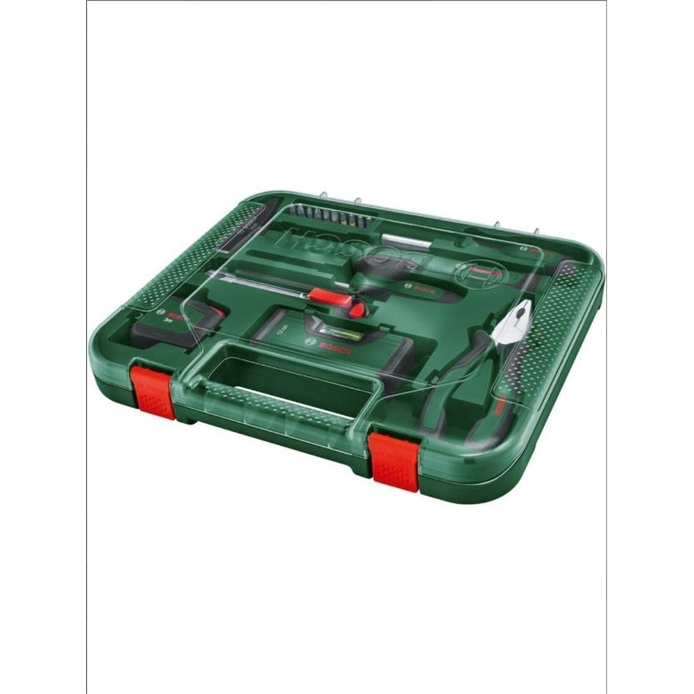 BOSCH UNİVERSAL EL ALETİ SETİ 17 PARÇA 1.600.A02.BY5 Bosch 17 parçalı üniversal el aleti seti, evde veya yolda çok sayıda DIY onarım, bakım ve dekorasyon zorlukları için doğru donanıma sahiptir. Set, 300 glık bir mühendis çekici, 3 mlik bir şerit metre, kopçalı bıçak, 25 cmlik su terazisi, kombine pense, bir bız, bir üniversal tornavida, 10 uç ve bir saklama kutusundan oluşur. Bu aletler, yüksek kaliteli malzemeler kullanılarak sağlam ve uzun ömürlü olacak şekilde üretilmiştir. Optimum konfor için yumuşak kavrama alanları veya kavisli formlar gibi ergonomik özelliklere sahiptirler. Özellikler Mühendis Çekici 300g: Düşük titreşimli, güçlü, hassas ve yumuşak kavramalı. Mezura 3 m: Otomatik kilitlemeli, sağlam ve ergonomik ve kemer klipsi. Maket Bıçağı : Otomatik kilitleme, yumuşak kavrama ve entegre bıçak saklama alanı. Su Terazisi 25cm: Yüksek hassasiyet, metrik ölçek ve v-Oluk. Kombine Pense: Sertleştirilmiş kesici kenar, hassas kavrama yüzeyi ve iki bileşenli sap. Bız: Krom vanadyum, ergonomik şekil ve yumuşak kavrama. Üniversal Tornavida: Manyetik uç tutucu, ergonomik yumuşak kavrama ve kayma önleyici. 10x Bits: PH1/2, PZ1/2, S4/5, T20/25, H4/5, S2 Çelik ve renk kodlaması. Saklama Kutusu: Sağlam tasarımlı ve kolayca taşınabilir. Teknik detaylar Çanta boyutu: 356x306x48 mm Alet Ağırlığı (net): 2234g Arz kapsamı 1x Kombinasyon Pense 1x Üniversal Tornavida 1x Çekiç 300g 1x Geçmeli Bıçak 1x Bız 1x Mezura 3m 1x Su Terazisi 12cm 10x Bit: PH1/2, PZ1/2, S4/5, T20/25, H4/5 1x Şeffaf kapaklı plastik kasa