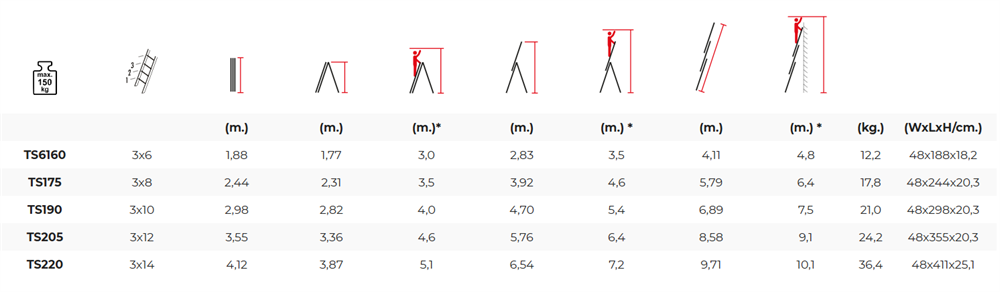 İleri Güvenlik Özellikleri: Kırmızı renkteki basamak, çıkılabilen maksimum güvenli basamağı işaret eder. Kilitli kancalar ve açılım limitleme pimi, güvenli bir kullanım deneyimi sağlar. TRIOCOMBI'nin tasarımı ve özellikleriyle güvenliğinizi en üst düzeyde tutabilirsiniz.