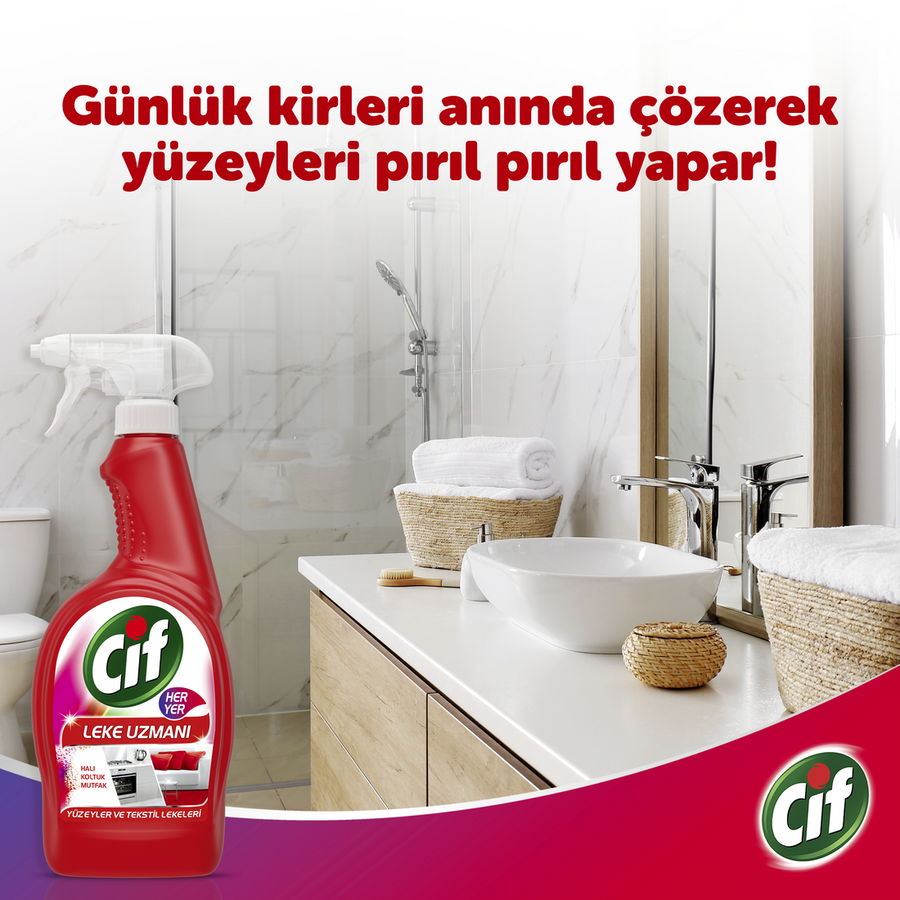 Cif Sprey Her Yer Leke Uzmanı, yaşam alanlarınızdaki leke kabusuna son veriyor. Özenle geliştirilen çok amaçlı formülü sayesinde pratik ve güvenli bir şekilde uygulayabileceğiniz leke çıkarıcı sprey, evinizin neredeyse her alanında korkusuzca kullanılabiliyor. Mutfak ve banyolarınızda oluşan su, kireç ve kir lekelerini anında çözerek yüzeyleri pırıl pırıl yapan Cif sprey, halı ve koltuk gibi yumuşak yüzeyleri temizlemek için de birebir. Bu bölgelerde bulunan zorlu ve inatçı lekelerin en büyük savaşçısı olan özel leke çıkarma formülü, giysilerde oluşan günlük leke ve kirler için de imdada yetişiyor.