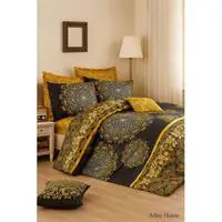 Şıklığı ve gösterişi yatak odanıza taşıyan Mira Home Varaklı Desenli Nevresim Takımı, göz alıcı siyah ve sarı tonlarının zarif birleşiminden oluşuyor. Altın varak desenlerinden ilham alınarak tasarlanan bu özel takım, odanıza lüks ve sofistike bir hava katıyor. p pamuk ve 0 polyester kumaşı sayesinde hem yumuşacık bir dokunuş sunar hem de dayanıklılığıyla uzun ömürlü kullanım sağlar. Paket İçeriği 1 adet nevresim (200x220 cm) 1 adet çarşaf (240x260 cm) 2 adet yastık kılıfı (50x70 cm) Yıkama Talimatı Maksimum 30°C sıcaklıkta yıkayınız. Çamaşır suyu kullanmayınız. Düşük ısıda ütüleyiniz. Kurutma makinesinde düşük devirde kurutulabilir. İlk yıkamada ayrı yıkayınız, açık renklerle birlikte yıkamaktan kaçınınız. Not: Ürün renkleri görsel çekim veya görüntülediğiniz cihaz kaynaklı ton farklılığı olabilir. Jelatin ambalaj ile paketlenmiştir.