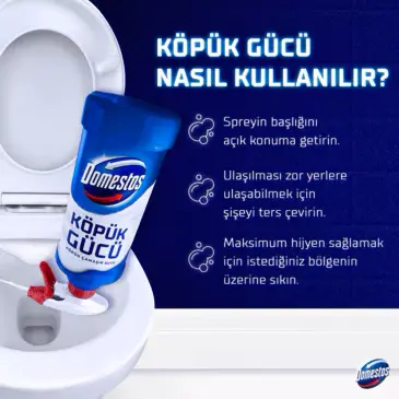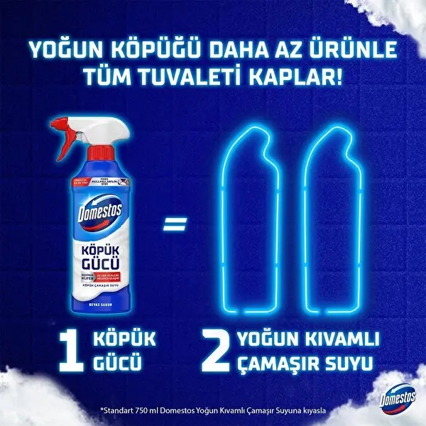 Domestos Köpük Gücü Köpük Çamaşır Suyu Beyaz Sabun 450 ml gerek ev ve ofis, gerekse diğer toplu alanlarda temizlik ve hijyeni sağlamak konusunda son derece başarılı bir üründür. Tam hijyen sağlayan formülü sayesinde tuvalet, banyo, mutfak gibi alanlarda mükemmel bir temizlik kalitesi sunmaktadır. Mikropları yok eden formülünün taşıdığı özel losyon, klasik çamaşır sularından farklı olarak ortamlarda ferahlık hissi yaratır.