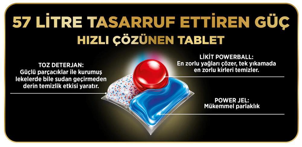 Gelişmiş yepyeni formülü ile Finish Quantum Ultimate bulaşık makinesi deterjanı teknolojisinde en son noktada! Toz deterjan güçlendirilmiş kırmızı parçacıklar ile 24 saat beklemiş lekelerde bile sudan geçirmeden derin temizlik sağlar. Likit Powerball en zorlu yağları çözer, tek yıkamada kurumuş salça sosu, yağlı et lekesi ve tavadaki yumurta lekesi gibi en zorlu lekeleri temizler. Power jel ise mükemmel parlaklık sağlar. 3 bölmeli yeni kapsül teknolojisi ile kolay çözülür !