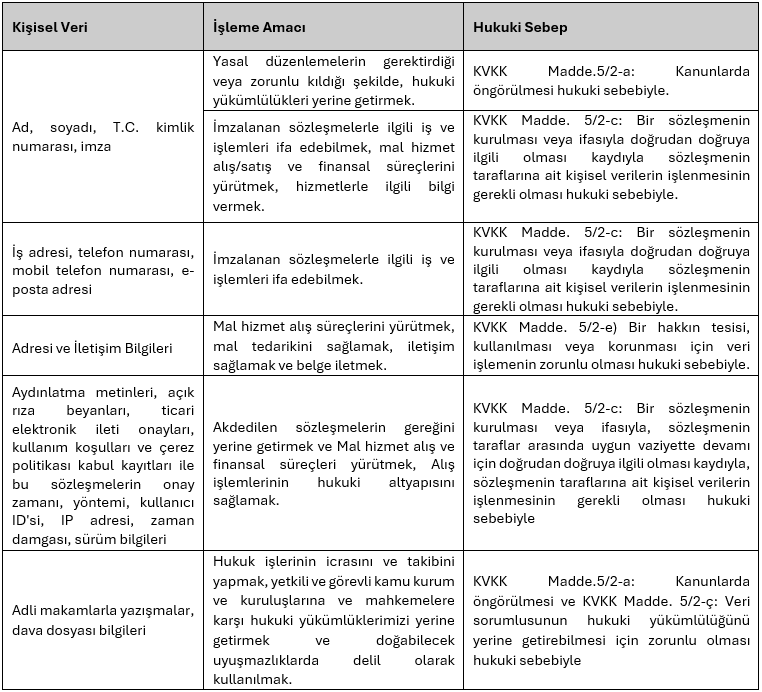Şirket tarafından kişisel veriler, ilgili kişilerin açık rızası, kanunlarda açıkça öngörülmüş olma, sözleşmenin kurulması ve ifasıyla doğrudan ilgili olma, veri sorumlusunun hukuki yükümlülüğünü yerine getirebilmesi için zorunlu olma, ilgili kişinin kendisi tarafından alenileştirilmiş olma, bir hakkın tesisi, kullanılması veya korunması için veri işlenmesinin zorunlu olması ve veri sorumlusunun meşru menfaatleri için veri işlenmesinin zorunlu olması hukuki sebepleriyle işlenmektedir.