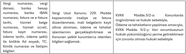 İşlenen kişisel verilerinizin işleme amaçlarına ve kişisel verilerin Kanunun 5 ve 6.ncı maddelerinde belirtilen işleme şartlarından hangisine dayanılarak işlendiği bilgilerine aşağıda yer verilmiştir. Kategori edilen bilgileriniz kullanımına göre birden fazla işleme amacı ve farklı hukuki işleme şartına sahip olabilmektedir.