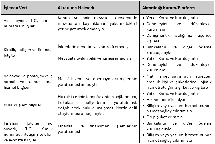Özel nitelikli veriler veri sahibinin açık rızası alınmadan işlenmemekte ve aktarılmamaktadır. Kişisel verilerinizin hangi kişi ve kurumlara hangi amaçlarla aktarıldığı aşağıda yer almaktadır.