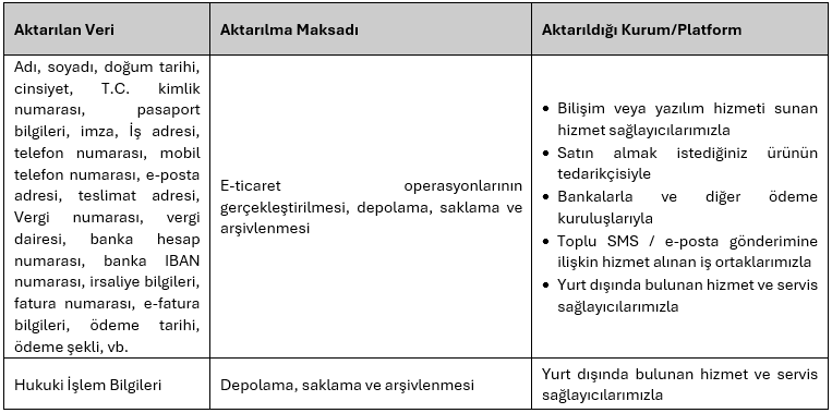 Aşağıdaki veriler, belirtilen maksatları ile, Açık Rızanızın alınması koşuluyla Yurtdışı Hizmet Sağlayıcılara aktarılacaktır. Bu kapsamda kişisel verileriniz KVKK’nın 9. maddesinde ve Kişisel Verilerin Yurt Dışına Aktarılmasına İlişkin Usul ve Esaslar Hakkında Yönetmelik’te öngörülen usul ve esaslara uygun şekilde hizmetin gerektirdiği ölçüde ve işleme amaçlarıyla sınırlı olmak üzere veri minimizasyonu ilkesine uygun şekilde aşağıda detaylıca alıcı grupları ile paylaşılmaktadır.