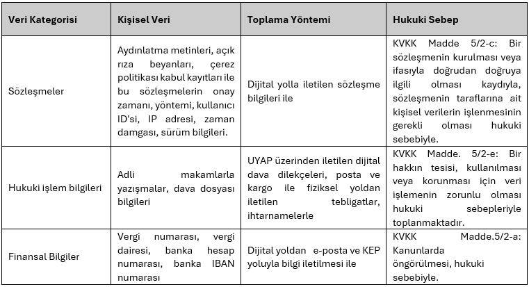 Kişisel verileriniz, KVKK’nın 5 ve 6. Maddelerinde sayılan hukuki sebeplere uygun olarak aşağıda detaylıca belirtilen yöntemlerle toplanmakta ve işlenmektedir.