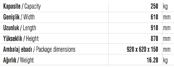 Jacx PTA250 Paket Taşıma Arabası, depo, lojistik, kargo ve mağaza içi taşıma operasyonlarında ağır paketlerin güvenli ve pratik şekilde taşınmasını sağlamak için geliştirilmiş dayanıklı bir taşıma ekipmanıdır. 250 kg taşıma kapasitesi sayesinde koli, ürün ve malzemelerin tek kişi tarafından kolayca taşınmasına yardımcı olur. Geniş platform yapısı yüklerin dengeli yerleştirilmesini sağlarken, sağlam metal gövdesi yoğun günlük kullanıma karşı yüksek dayanıklılık sunar. Ergonomik itme kolu sayesinde kullanıcı konforu artırılır ve manevra kabiliyeti kolaylaşır. Katlanabilir tasarımı, kullanılmadığında minimum alan kaplayarak depolama ve nakliye avantajı sağlar. Sessiz çalışan tekerlek sistemi, iç mekân zeminlerinde akıcı hareket imkânı sunarken zemine zarar vermez. İş gücünü azaltan pratik yapısı ile e-ticaret depoları, üretim alanları ve sevkiyat operasyonları için ideal bir yardımcıdır.