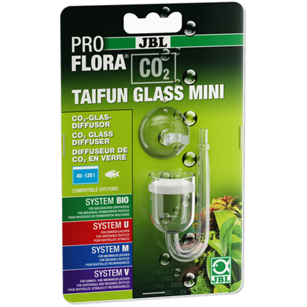 Bitkiler için ideal beslenme Akvaryum bitkileri için sudaki doğru CO2 oranı büyük önem taşır. Karbondioksit bitkilerin temel besin maddesidir ve görkemli bir şekilde gelişmelerini teşvik eder. Bitkiler CO2'yi fotosentez için kullanır ve buna karşılık suya yaşamsal önem taşıyan oksijen salarlar. Yosun gelişimini önler, zararlı maddeleri giderir, saklanma olanağı sunar ve hastalık mikroplarını azaltırlar. Akvaryum suyunun CO2 bakımından verimli bir şekilde zenginleştirilmesi: CO2, difüzörün içerdiği özel bir membran üzerinden akvaryum suyuna nüfuz eder. Çok küçük olan CO2 kabarcıkları akvaryum suyunda çok iyi çözünür. JBL TAIFUN GLASS difüzörü 3 ayrı boyda mevcuttur: JBL PROFLORA CO2 TAIFUN MINI: 40 ila 120 l arasındaki akvaryumlar içindir, yükseklik 67 mm, genişlik 37 mm, vantuz içermez, difüzör çapı 25 mm JBL PROFLORA CO2 TAIFUN MIDI: 60 ila 300 l arasındaki akvaryumlar içindir, yükseklik 76 mm, genişlik 42 mm, vantuz içermez, difüzör çapı 30 mm JBL PROFLORA CO2 TAIFUN MAXI: 160 ila 800 l arasındaki akvaryumlar içindir, yükseklik 90 mm, genişlik 58 mm, vantuz içermez, difüzör çapı 40 mm