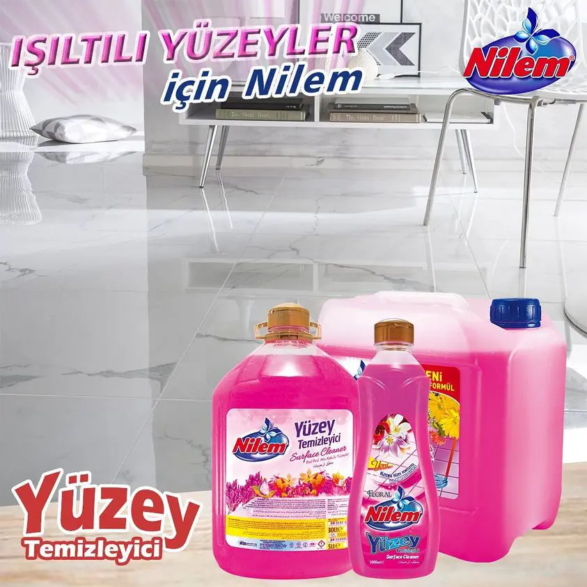 Nilem Yüzey Temizleyici, yüzeylerde oluşan her türlü lekeyi, kiri, iz ve yapışkanlık bırakmadan temizler. tüm yüzeylerdeki sinmiş kokuları kalıcı parfümü ile yok eder, temizliğin kokusunu evinize taşır. Nilem Yüzey Temizleyici her türlü yüzeyde durulamadan, kurulamadan güvenle kullanabileceğiniz, pratik temizlik ürünüdür. Banyo, fayanslar, mutfak tezgâhları dâhil tüm yüzeylerde ki inatçı lekeleri daha hızlı ve yorulmadan ortadan kaldırmanıza yardımcı olur. Çamaşır suyu eklenmiştir, bu yüzden ekstra bir temizleyiciye ihtiyacınız olmadan temizliğinizi en güzel şekilde yapabilirsiniz. Eviniz pembe çiçeğini uzun ömürlü, güzel kokusunu alır.