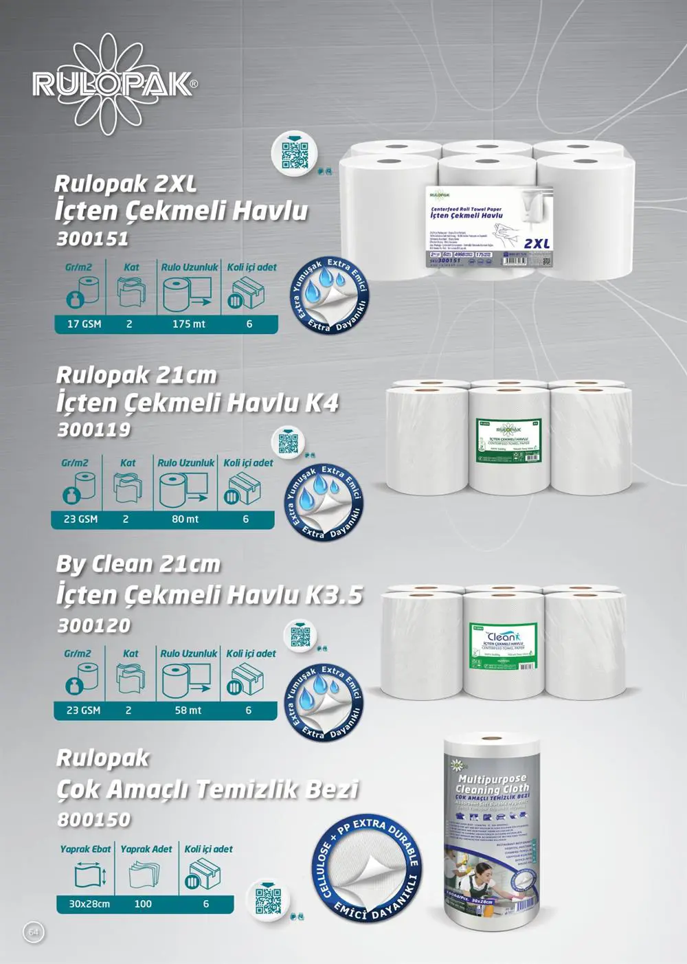 Rulopak içten çekmeli kağıt havlu sadece elinizde ve yüzünüzde değil, ofiste, kafede, restoranda, mutfakta, banyoda ve diğer tüm alanlarda rahatlıkla kullanabileceğiniz kalitede ve yeterlilikte bir ürün. Yüksek emiciliğe sahip kalın ve yumuşak dokusuyla her yüzeyde etkili bir temizlik sağlar.