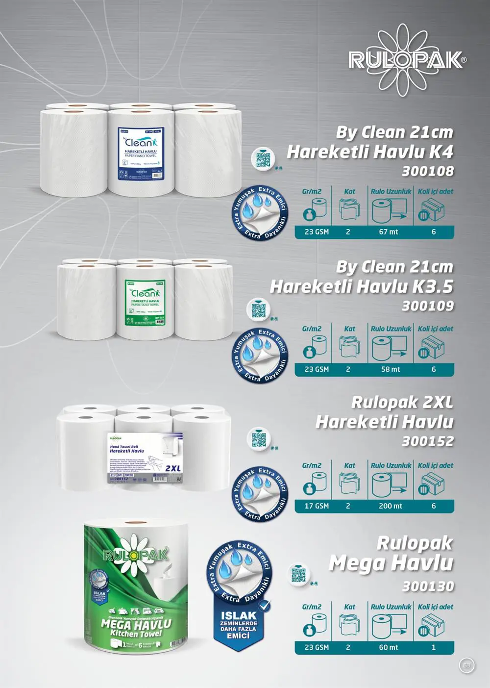 Rulopak hareketli kağıt havlu sadece elinizde ve yüzünüzde değil, ofiste, kafede, restoranda, mutfakta, banyoda ve diğer tüm alanlarda rahatlıkla kullanabileceğiniz kalitede ve yeterlilikte bir ürün. Yüksek emiciliğe sahip kalın ve yumuşak dokusuyla her yüzeyde etkili bir temizlik sağlar.