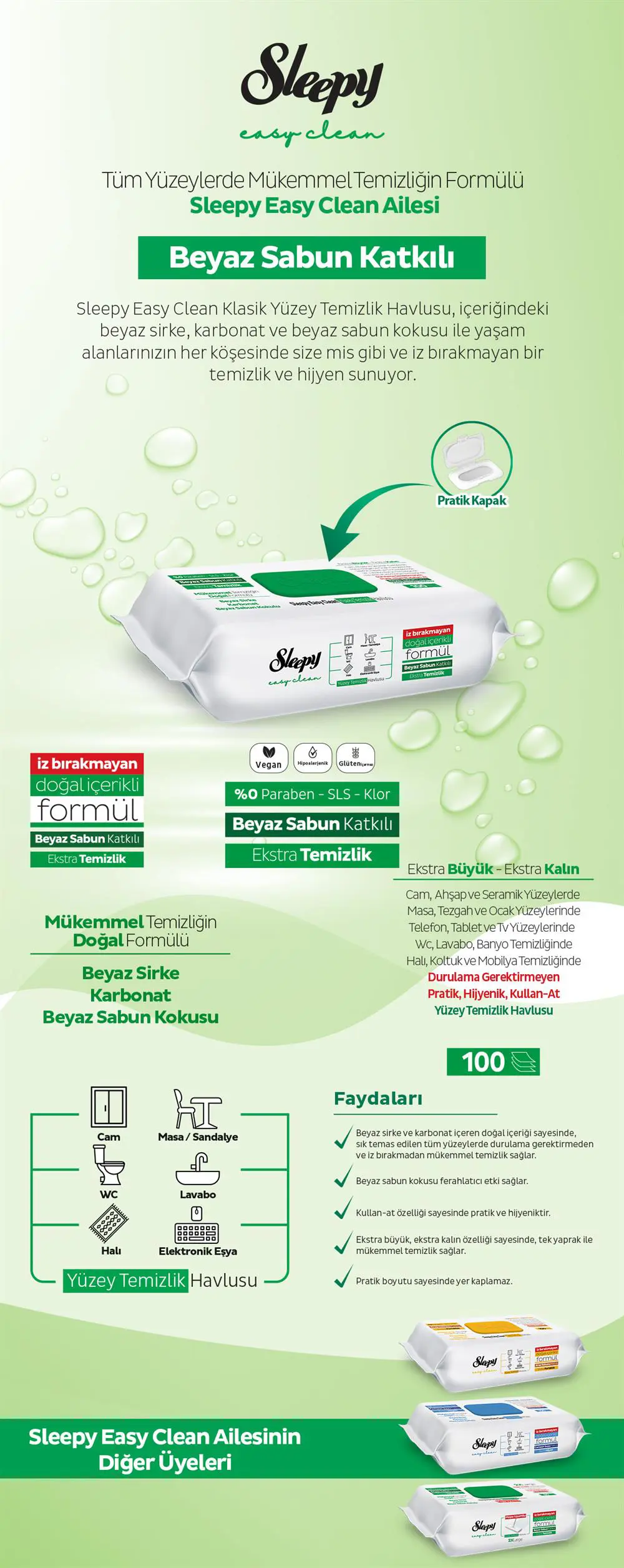 '' Sleepy Easy Clean Beyaz Sabun Kokulu Yüzey Temizlik Havlusu '' ofiste, evde ve dış mekanlarda temas edilen tüm yüzeylerde hijyen sağlamaya yardımcı olur. İz bırakmayan doğal içerikli formülü sayesinde bir çok alanda kullanılabilir. Beyaz sirke ve karbonat içeren doğal içeriği sayesinde, sık temas edilen yüzeyleri durulama gerektirmeden temizler. İçeriğinde bulunan özel formüllü solüsyon ile birlikte masa, sandalye, sehpa, tezgah, kapı kolları, ev ve ofiste kullanılan tüm eşyaların ve yüzeylerin temizliği için kullanılan hijyenik yüzey temizleme ürünüdür. Durulama gerektirmez, pratiktir.
