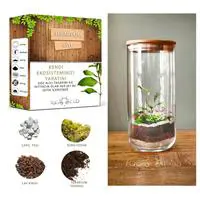 İçinde bitki bulunan bir teraryum camı oluşturmak için gerekli tüm alet ve malzemeleri içerir.