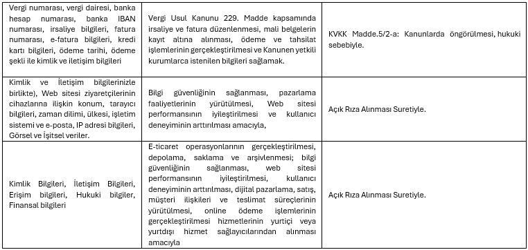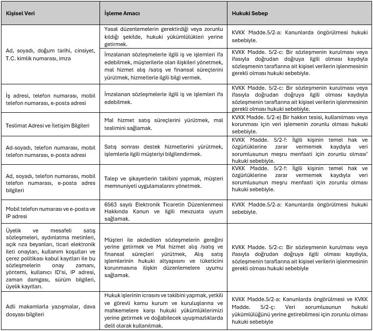 Şirket tarafından kişisel veriler, ilgili kişilerin açık rızası, kanunlarda açıkça öngörülmüş olma, sözleşmenin kurulması ve ifasıyla doğrudan ilgili olma, veri sorumlusunun hukuki yükümlülüğünü yerine getirebilmesi için zorunlu olma, ilgili kişinin kendisi tarafından alenileştirilmiş olma, bir hakkın tesisi, kullanılması veya korunması için veri işlenmesinin zorunlu olması ve veri sorumlusunun meşru menfaatleri için veri işlenmesinin zorunlu olması hukuki sebepleriyle işlenmektedir.