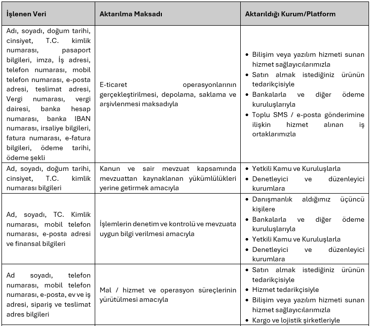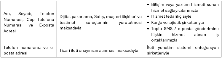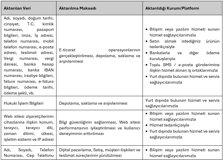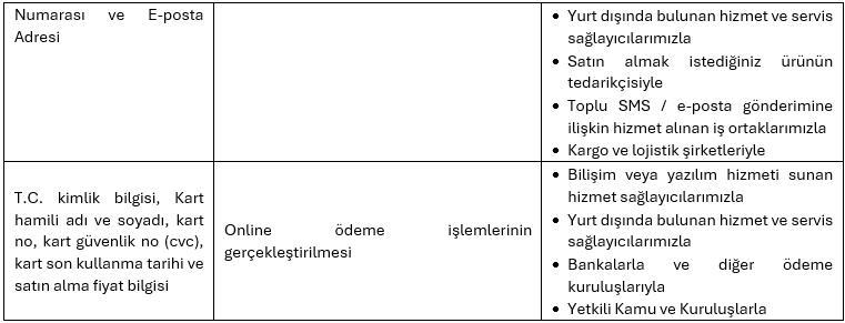 Aşağıdaki veriler, belirtilen maksatları ile, Açık Rızanızın alınması koşuluyla Yurtdışı Hizmet Sağlayıcılara aktarılacaktır. Bu kapsamda kişisel verileriniz KVKK’nın 9. maddesinde ve Kişisel Verilerin Yurt Dışına Aktarılmasına İlişkin Usul ve Esaslar Hakkında Yönetmelik’te öngörülen usul ve esaslara uygun şekilde hizmetin gerektirdiği ölçüde ve işleme amaçlarıyla sınırlı olmak üzere veri minimizasyonu ilkesine uygun şekilde aşağıda detaylıca alıcı grupları ile paylaşılmaktadır.
