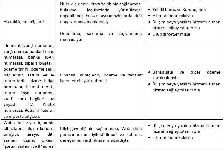 Özel nitelikli veriler veri sahibinin açık rızası alınmadan işlenmemekte ve aktarılmamaktadır. Kişisel verilerinizin hangi kişi ve kurumlara hangi amaçlarla aktarıldığı aşağıda yer almaktadır.