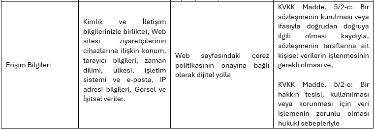 Çerezler: Şirket resmi internet sitesinde ziyaretçilerin siteye girdiği an erişebileceği Çerez Aydınlatma Metni ve Çerez Ayarları ile kişisel verilerin hukuka uygun bir şekilde işlenmesi sağlanmaktadır.